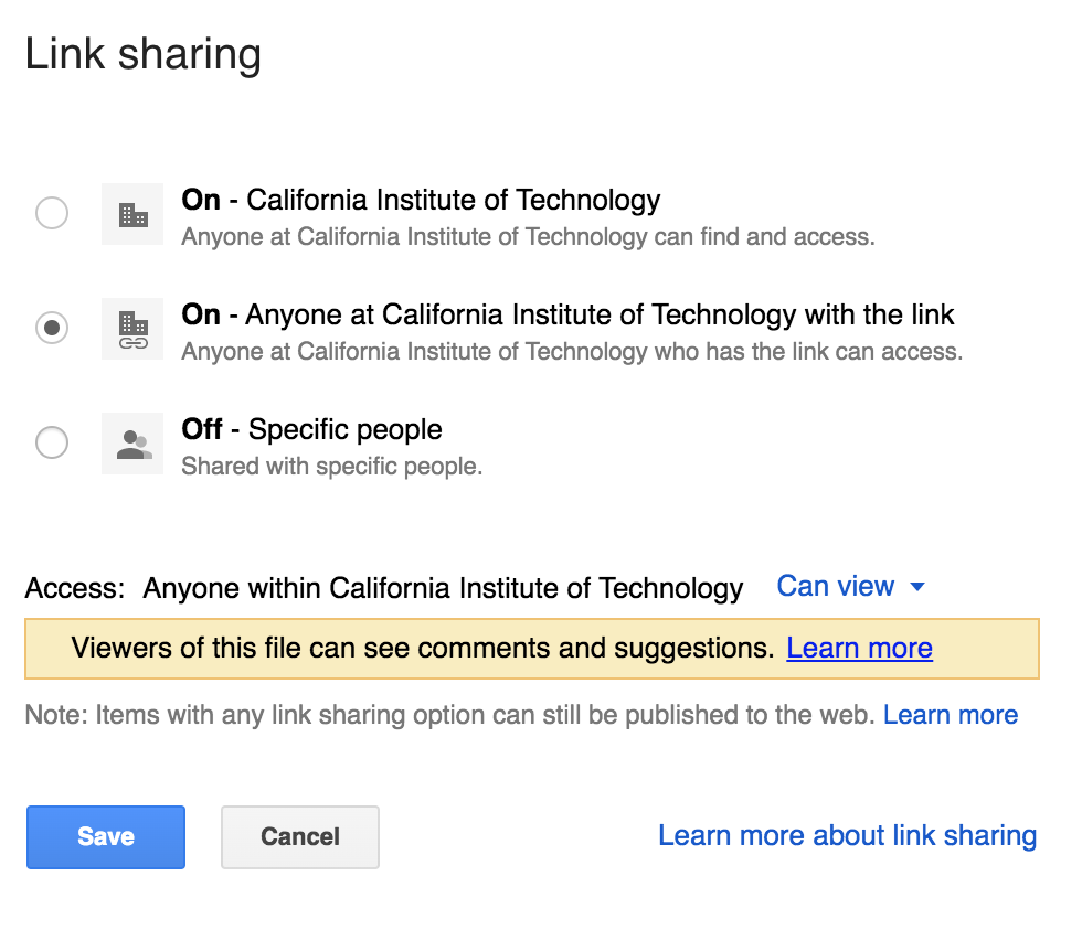 - Under Link sharing, choose On – Anyone at California Institute of Technology with the link, and click Save