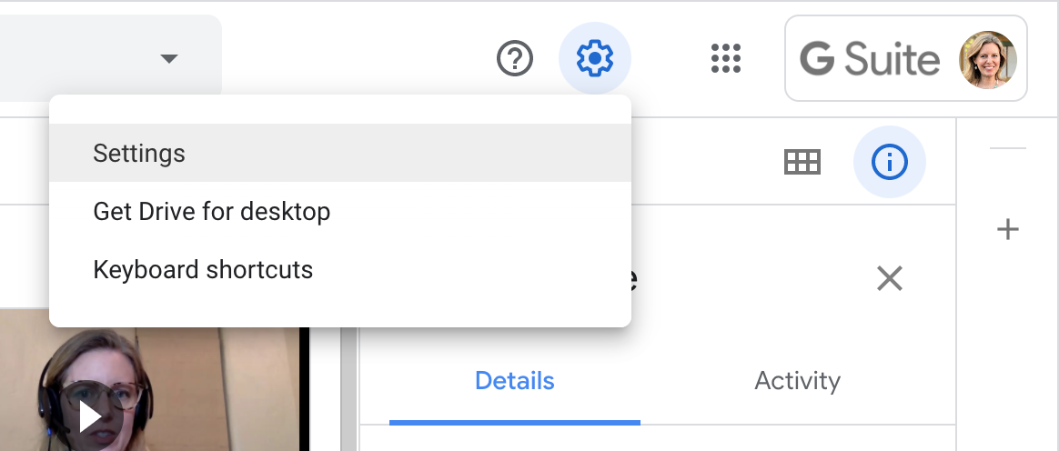 - In the upper right-hand corner of Google Drive, click on the gear icon, then click on Settings
