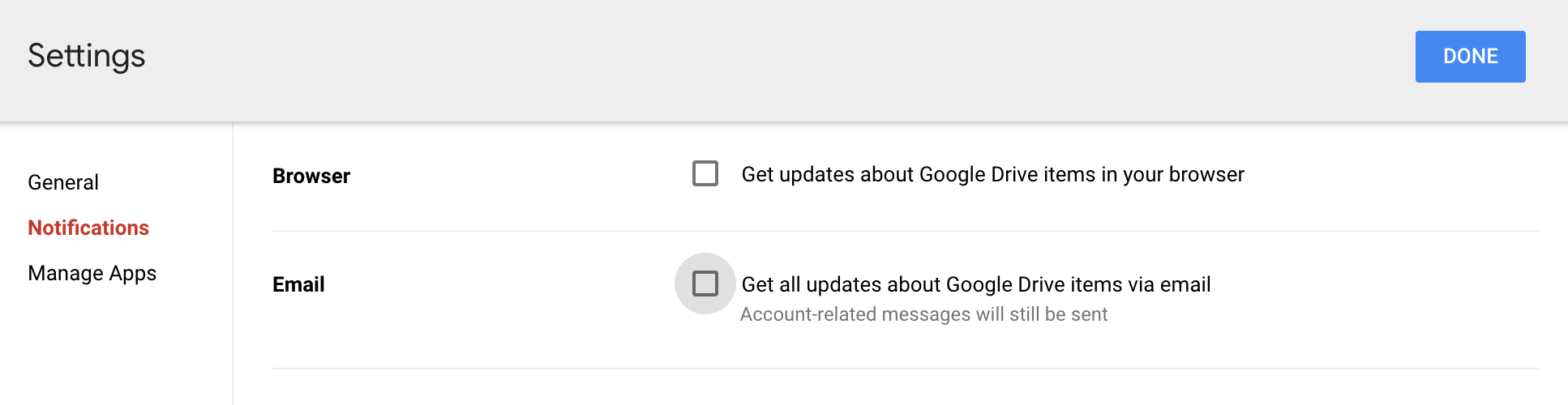 - Click on Notifications and un-check Email: Get all updates about Google Drive items via email, click Done
