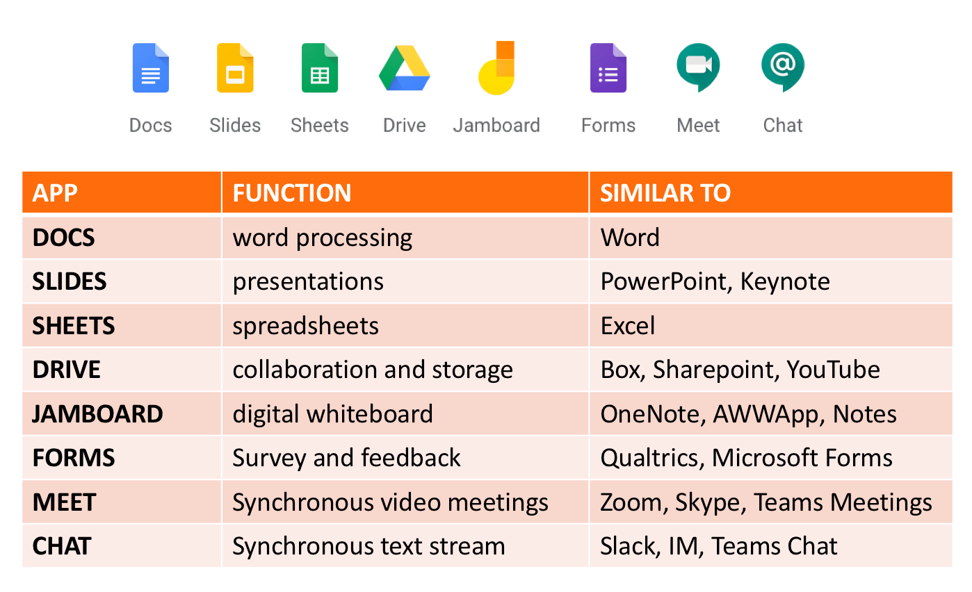 - Collaboration: Docs, Slides, Sheets, Drive, Jamboard