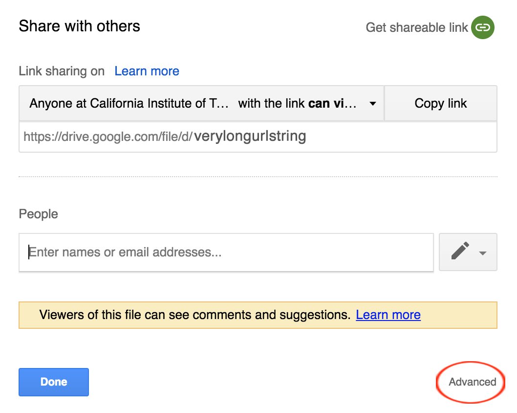 - Choose Link sharing = On – Anyone at California Institute of Technology with the link can view. and click on Done. Click on Advanced to double-check find and access is not checked