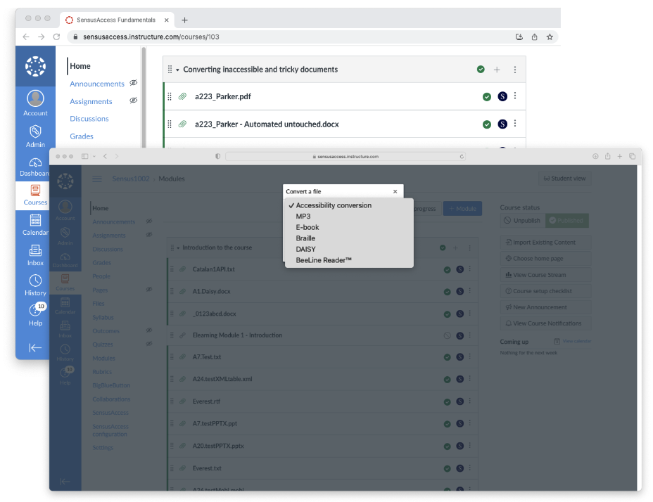 SensusAccess makes conversion of course material (such as textbooks, journal articles, links to optional readings, lecture notes, presentations, hand-outs, exercises and assignments) into audio books, Braille, digital large-print, e-books and other accessible formats available directly from within Modules, Files, Assignments, Discussions, Pages and Quizzes. Converted documents can be downloaded directly or delivered to the registered email address of the user.